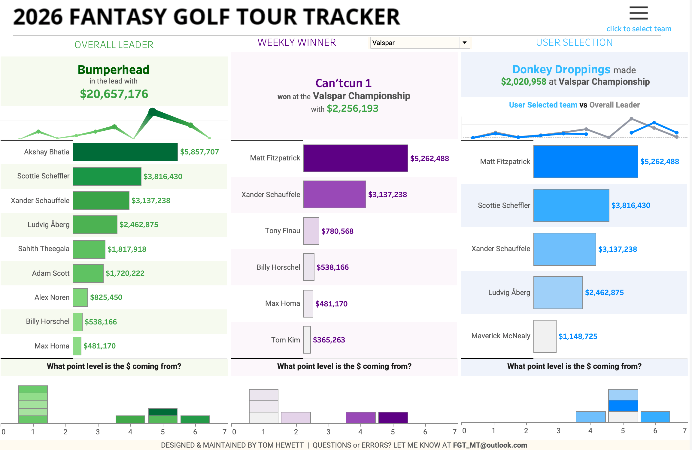 He was only picked 8 times this year, and five of those were with Schauffele (T4, with Sungjae and Penge). Three teams had just those guys in the tournament this week, and they still managed a respectable T4 finish in our game. The winner was Can’tcun1, who added Tom Kim, Finau, and Horschel to those two to take the victory by a slim $5,000 over Irish Sluggers (tough luck there chaps). This moves Can’tcun1 up from 29th to 10th overall. Not bad.